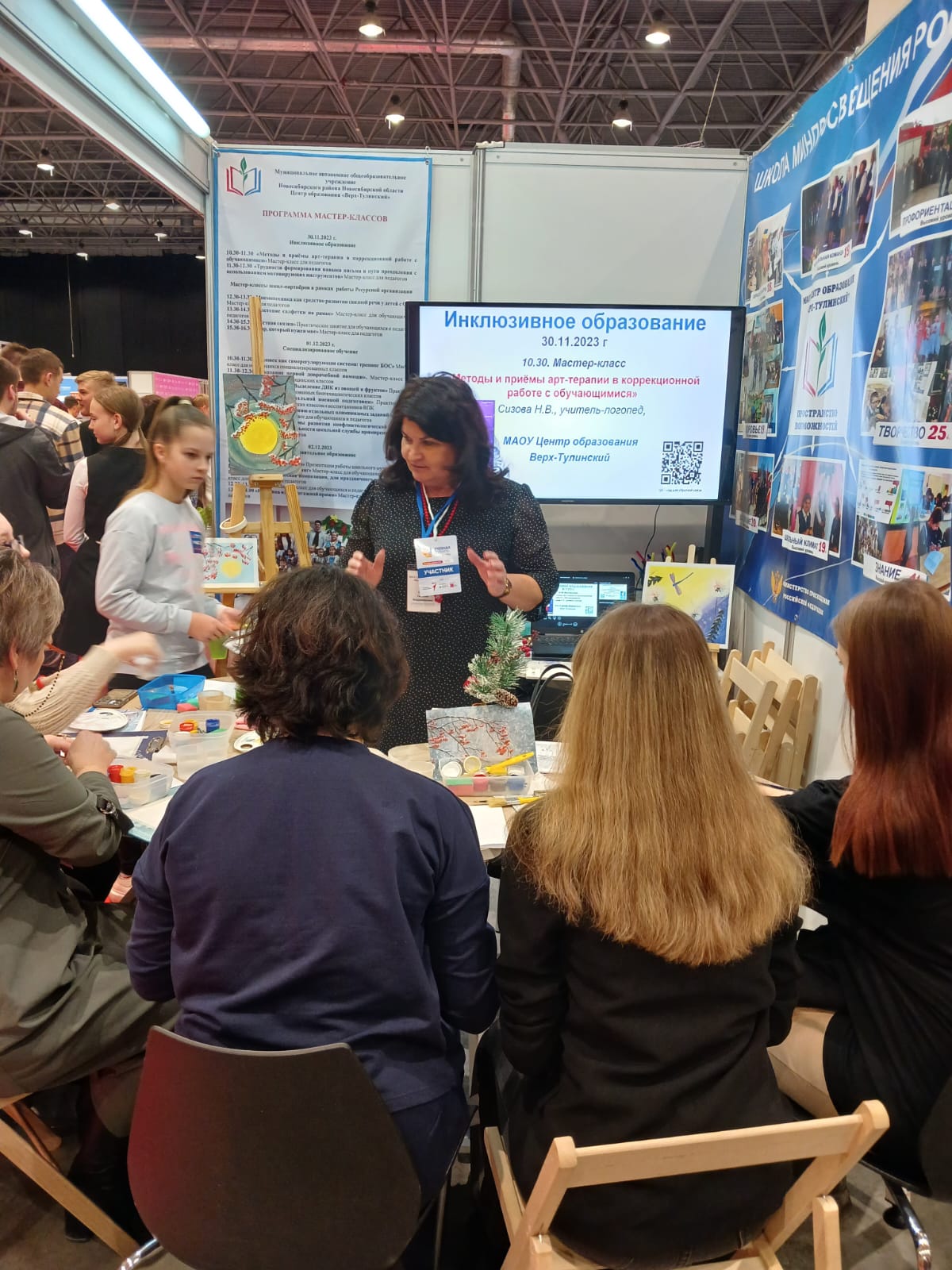 Сизовой Наталией Владимировной учителем - логопедом МАОУ Центр образования «Верх- Тулинский" был представлен мастер-класс для педагогов «Методы и приёмы арт-терапии в коррекционной работе с обучающимися» как визуальная методическая разработка, которая может быть использована как на уроках изобразительного искусства, так и при организации коррекционных занятий с обучающимися. Дети и взрослые имели возможность познакомиться с приемами изотерапии («пуантилизм»). Во время проведения мастер-класса было поэтапно показано, как можно нарисовать ветку рябины с применением техники арт - терапии и приемов правополушарного рисования. Ссылка на сайт школы http://co-vt.com.ru/?view=article&id=560:uchebnaya-sibir-2023-den-pervyj&catid=9